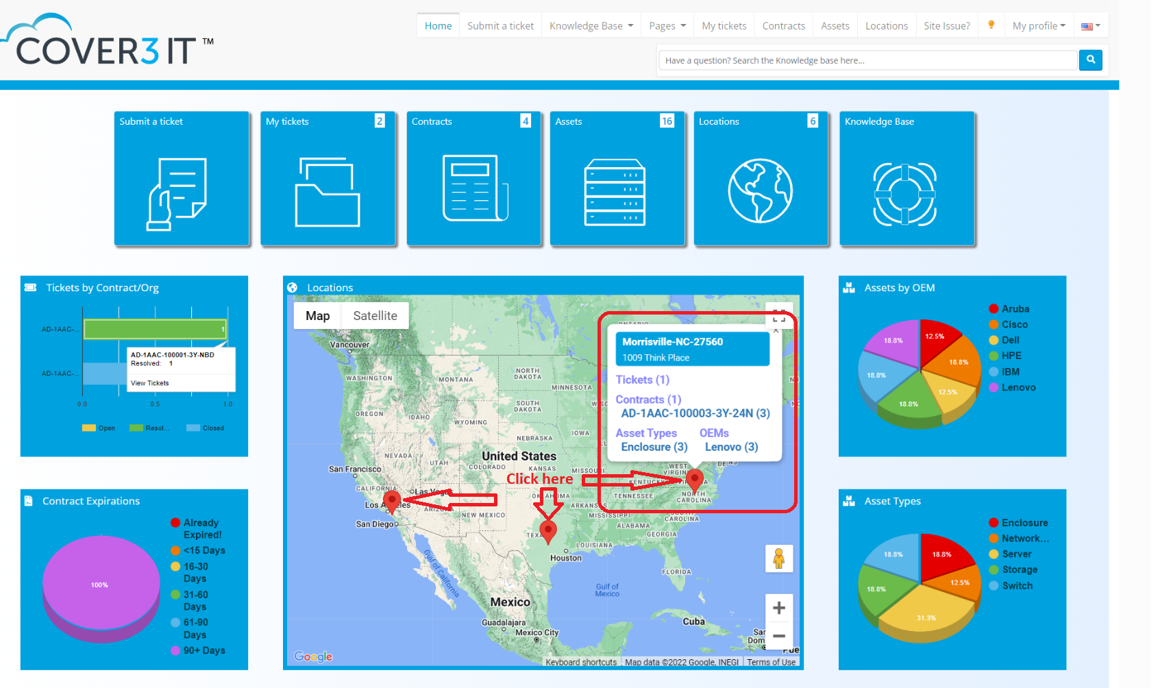 The MULTI-LOCATION DASHBOARD will display a map of where your assets are located (clickable for quick access), contract expiration data and other data associated with your ASSETS.