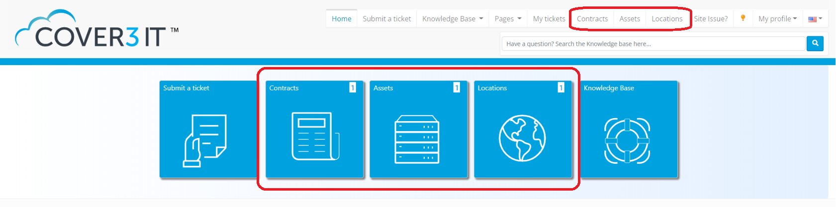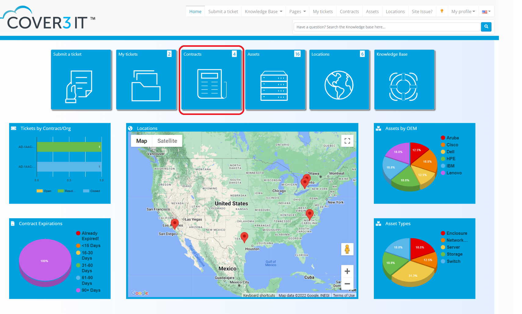 The CONTRACTS PAGE will allow access to your contracts (and the more assets and locations you have, the more information the DASHBOARD will display).
