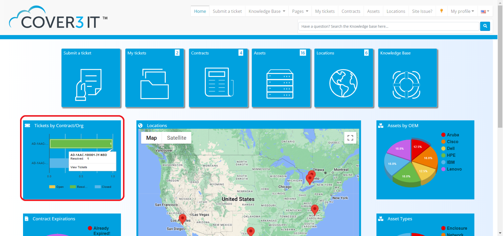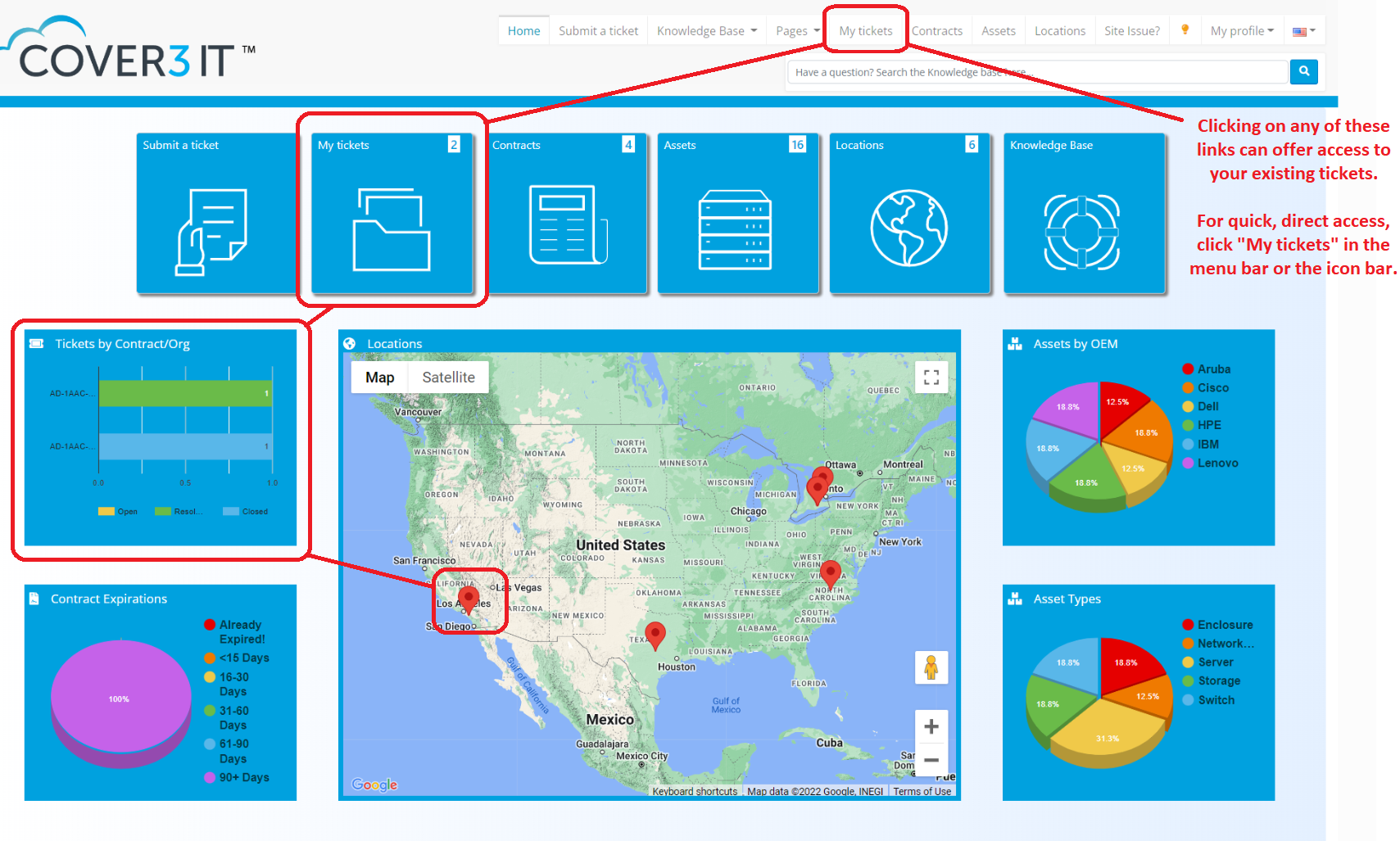 Accessing Your Tickets Previous AMS User Guide The Welcome Page Your Dashboard The Contracts Page, Part I The Contracts Page, Part II The Assets Page Submit a Ticket Accessing Your Tickets Your Open Tickets Notifications Closing and Accessing Closed Tickets Your Profile Miscellaneous - Knowledge Base Next Accessing Your TicketsAside from clicking the "VIEW TICKETS" link in the email you receive after successfully submitting a ticket, you can access your tickets by clicking the following links in your DASHBOARD: Categories AMS User Guide 13 Pages 1